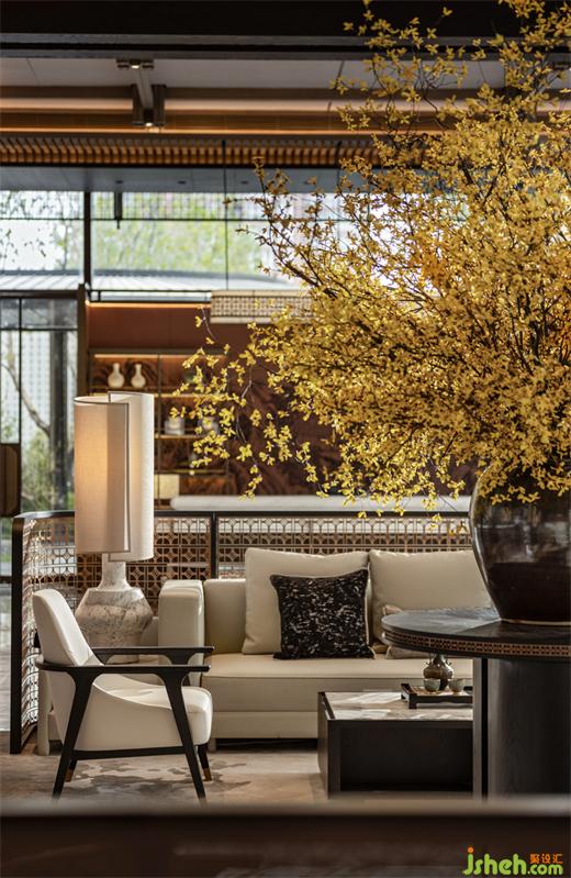 營銷中心設(shè)計對稱均衡的空間布局與古都中軸線交相輝映,黑木以翠綠如玉的石紋點綴,暖光映襯下,盡顯溫潤文雅之風。