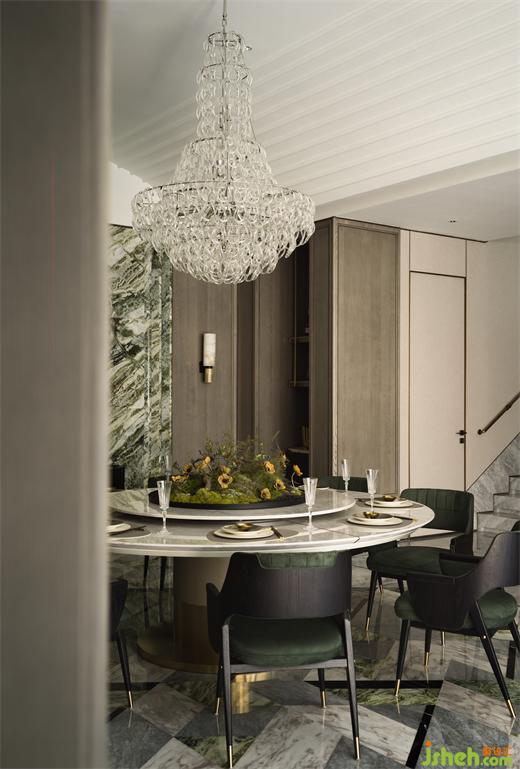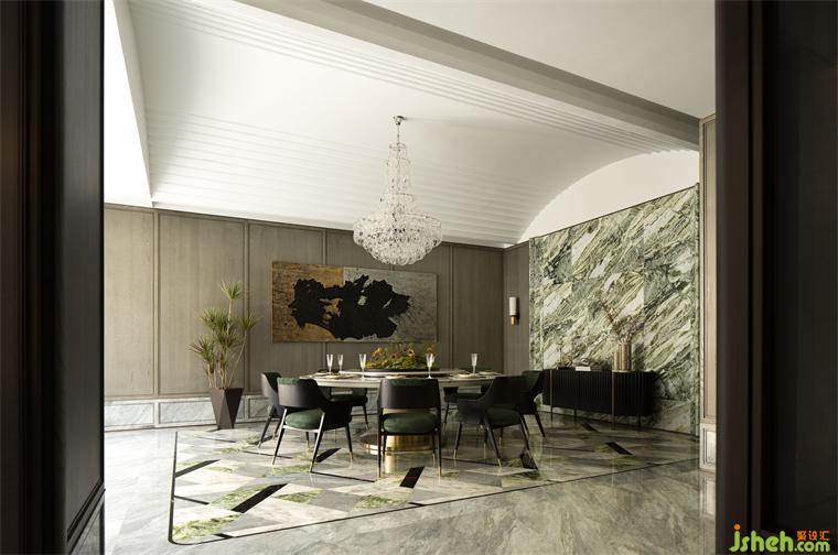 私宴廳在天花上花了一些心思,將傳統(tǒng)合院的曲面天花與輕法式裝飾相結(jié)合,樣板間設(shè)計(jì)將美學(xué)的感性和建筑的藝術(shù)性做了最完美的平衡,雅奢浪漫而不失氣韻。