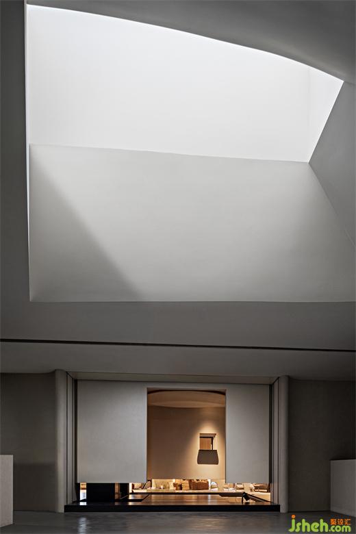 The sky light slanted down, with a kind of quiet and sacred, as if to remind people to leave the noise, open a heterotopia journey. The white construction quietly hangs on the blackstone, the flowing light and shadow suggest the passage of time, and the space is pure and mysterious.