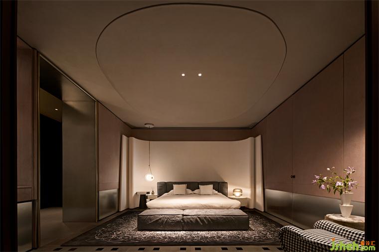 粉色絨面皮結(jié)合畫(huà)軸造型的米白色絨布材質(zhì)的床背景,讓空間保留圍合的同時(shí),可以自由呼吸。燈的光暈折射在鍍鋅鋼板上,使情緒隨視線自然流轉(zhuǎn),空間的層次和厚度給人一種舒適的包裹感。