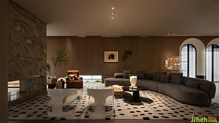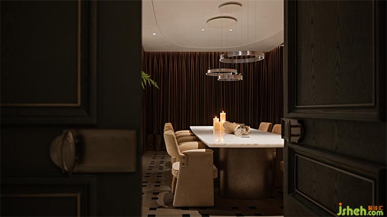 VIP私宴區(qū),私密性和開(kāi)放性兼具,視線的主角是透過(guò)翡翠綠大理石飄窗外的城市天際。展示空間設(shè)計(jì)淺色地板與黑色地板拼成的優(yōu)雅拼花經(jīng)典溫潤(rùn),是一種記憶與當(dāng)下的交織和碰撞,形成一種語(yǔ)言的豐富性和張力。學(xué)術(shù)研討會(huì)、商務(wù)會(huì)談、私宴等活動(dòng)輪番上演,溝通在這里自然發(fā)生,創(chuàng)造無(wú)限可能性。