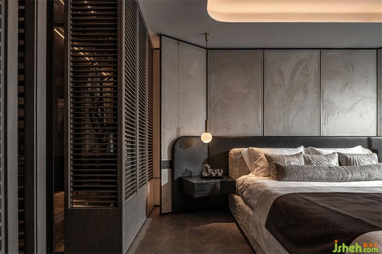 臥室對品質(zhì)極致考究,用深色調(diào)的基底,搭配麂皮、皮革、絲綢、實木的組合變化,蘇州樣板房設(shè)計營造空間層次與韻律,寬屏的床背與空間藝術(shù)品、硬裝塊面之間的肌理呼應(yīng),散發(fā)出儒雅的中性魅力。