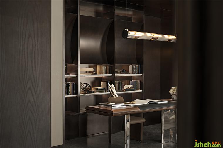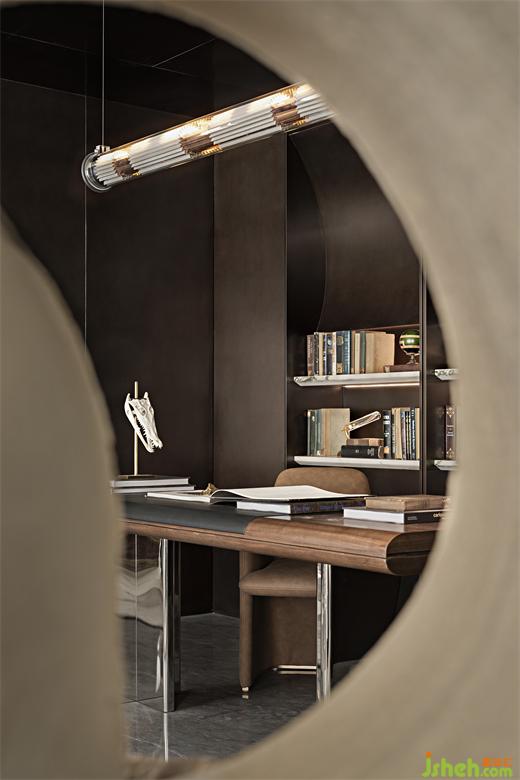 書房與休閑客廳連通,整面墻的內(nèi)置書架,琳瑯滿目的藝術(shù)品和書籍,就如一個優(yōu)雅而充滿書生氣的會客廳。試想下,或有人隨意翻動書卷,或有人舉著酒杯閑談,或有人盯著藝術(shù)品發(fā)呆,人們在此相聚卻又各自有自己的世界,也是挺有趣的。