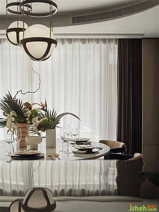 自然的暗示,在細(xì)膩的空間中絲絲扣入心弦。樣板房設(shè)計(jì)有機(jī)的形狀、柔和的曲線,中性的大地色輔以調(diào)動情緒的寶石色調(diào)——從綠松石到青玉——互相點(diǎn)綴。