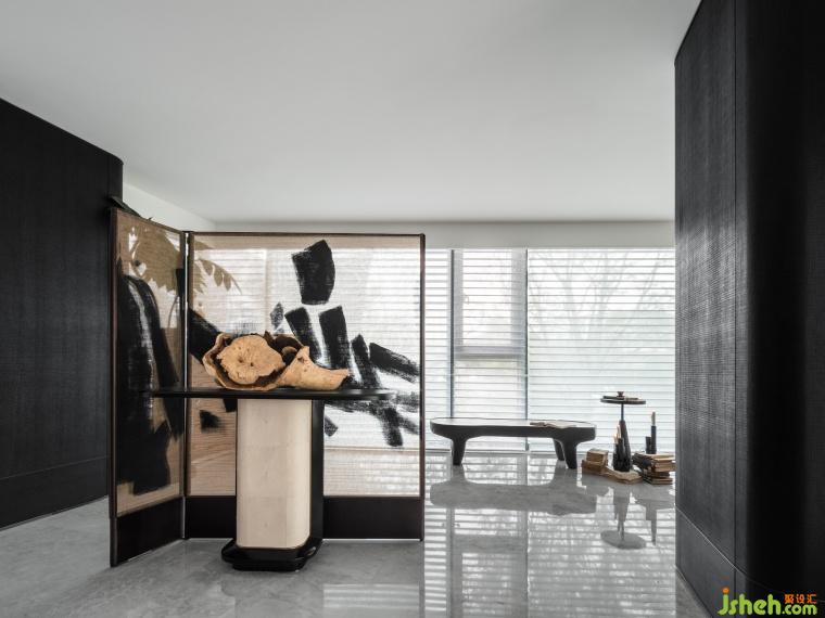 東方的隔斷充滿著意猶未盡的美感,一方屏風(fēng),用藝術(shù)的手法著于飾面之上,以低飽和度的金絲紗重新解構(gòu)書法畫作,矜貴之下不失雅奢的東方質(zhì)感,成為整個空間頗具趣味的點(diǎn)睛之處。