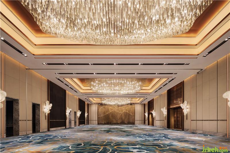 浪漫氣息被延續(xù)到宴會廳的設(shè)計中。天花垂落的水晶燈,凝固漁網(wǎng)打撈時水珠滴落的唯美瞬間,燈管末端散發(fā)的柔和光芒,似無數(shù)珍珠匯聚流溢出的瑩潤珠光。墻面的裝飾水晶燈,以漁網(wǎng)撒開時的飄逸造型,增強空間的藝術(shù)氣質(zhì)。裝修設(shè)計