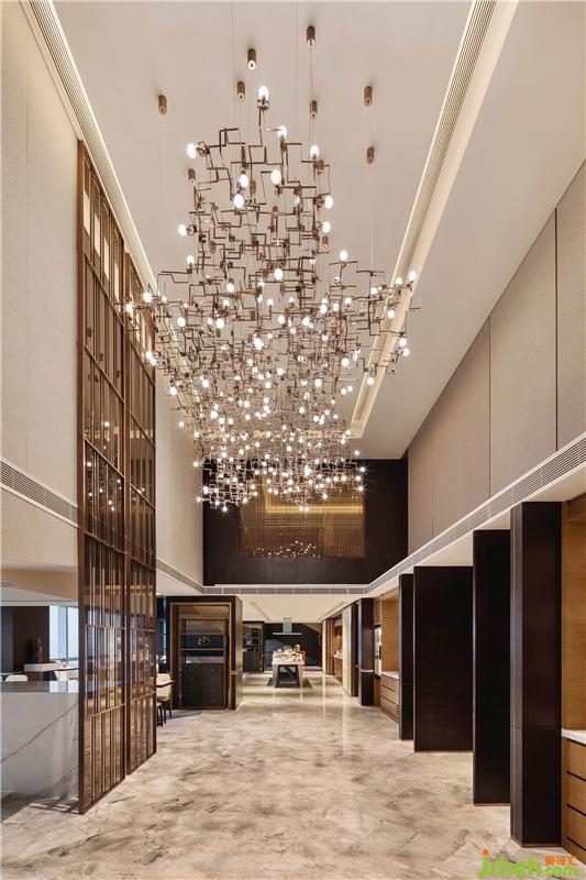 行政酒廊充分結(jié)合建筑本身的飄帶傾斜角,以原木跌級造型設(shè)計天花,營造深淺有序的變化美。