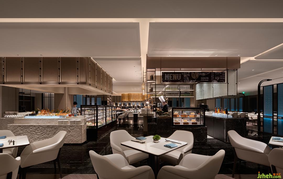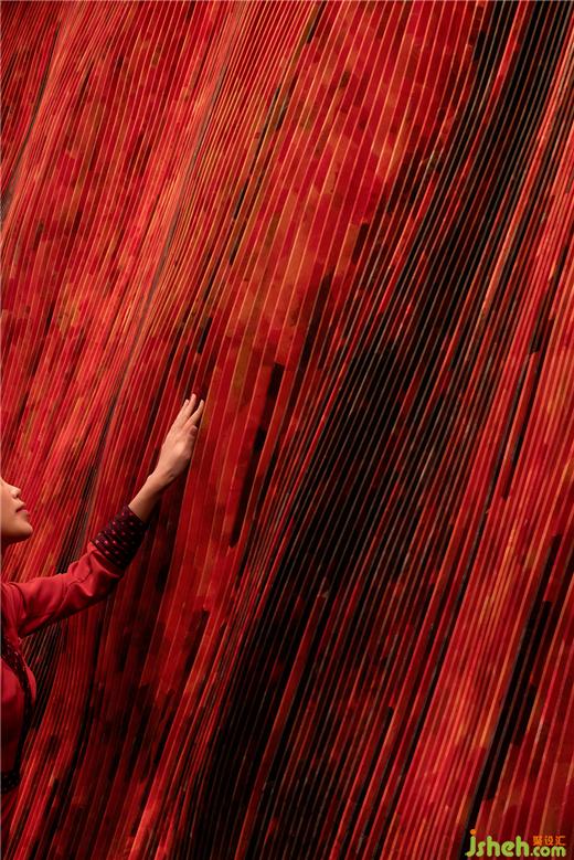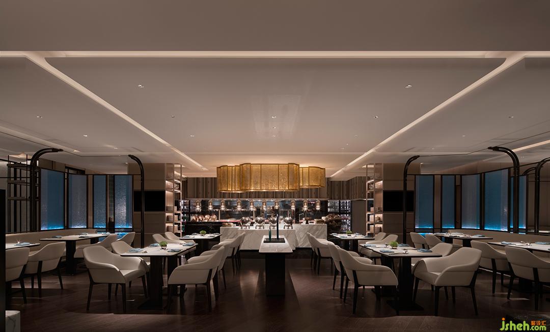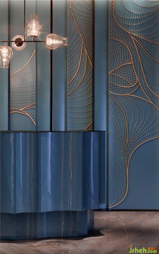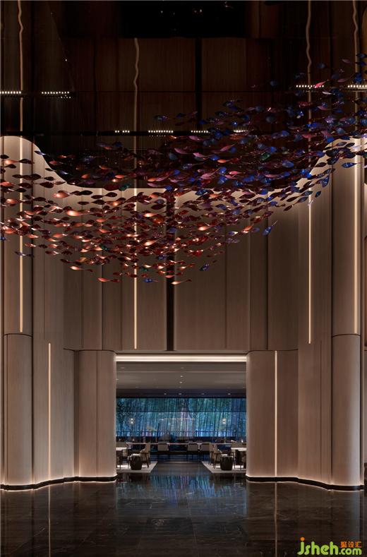 特別設(shè)置嵌入式壁爐,火焰躍動長夜,靜謐無聲燃燒,宜圍爐品茗,或文學(xué)沙龍?;⌒文緣ρ由熘岭娞輳d,如游園小徑曲折幽邃,赤色玉璧上水紋旋轉(zhuǎn)相生,以文人之雅,禮迎中外。