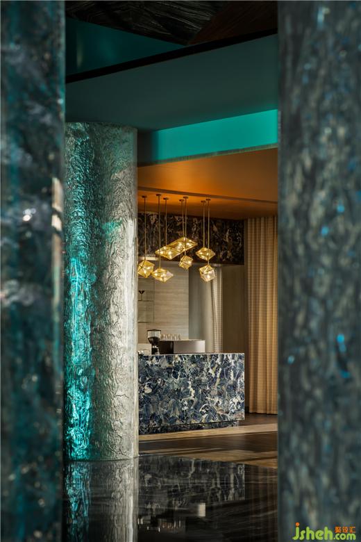 總臺后一叢叢青金石粗糲生長,光河在棱角中沖撞,仿若繪制中的梵高星空,靜謐燃燒宇宙的弦。平滑如鏡的大理石地面,不動聲色地照映萬物,模糊了虛實界限。