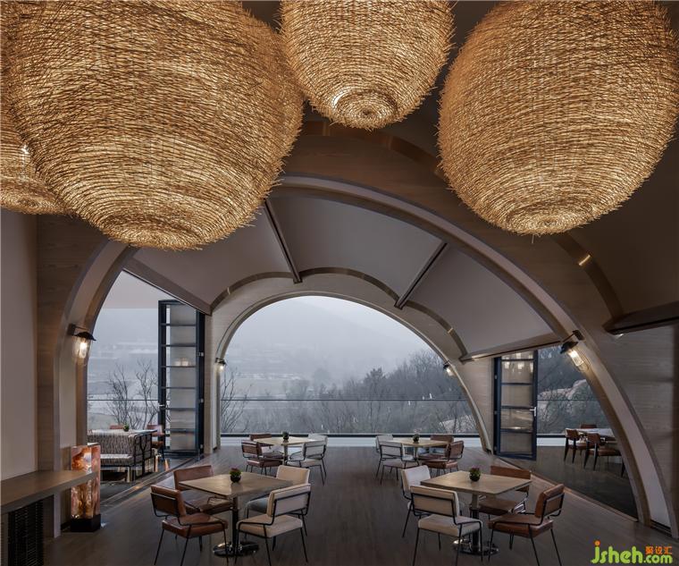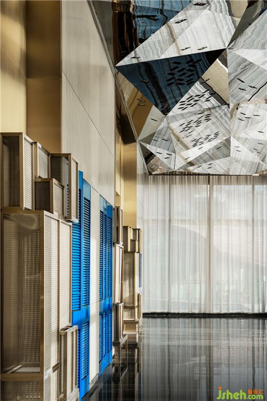 東方既白,光線穿透全幕幻彩玻璃大門,噴濺寶石虹彩。躍金沉璧,大堂流溢輕盈的夢。懸浮的鏡面金屬構成巨大茶晶,似琥珀凝駐歲月。南京園博園英迪格酒店設計八根亞克力圍裹原木廳柱,身披銀色風蝕銹衣,書寫遠古叢林的神秘。