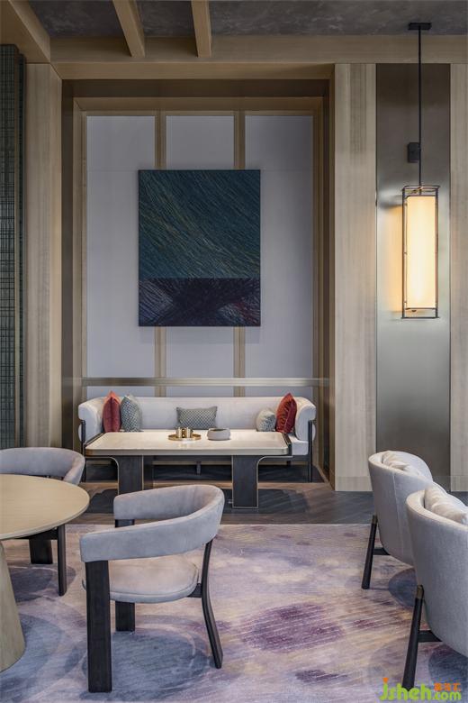 步入大堂,渺渺水波漫溢而下??~碧、天青、黛色陶磚鱗次櫛比,似漢瓦瀉地。月白線紋逡點(diǎn)時(shí)間的漣漪,金色垂絲掩映,旁邊象牙色大理石散落陰刻的柳葉,拉深空間層次。