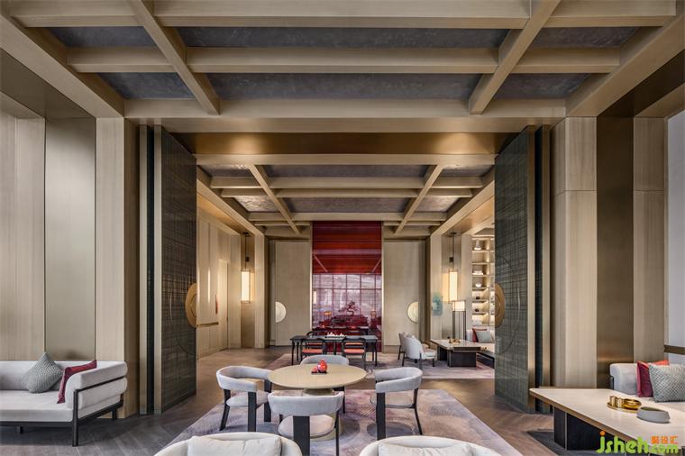 百盞水晶燈裊裊浮空,寫意柳絮因風(fēng)起,吹落萬(wàn)千雪。西安浐灞華邑酒店設(shè)計(jì)緣自斗拱結(jié)構(gòu)的古銅色方柱陣列兩側(cè),肅穆空間威儀。頂端昂嘴銘刻“褔祿壽喜”等篆字,如書畫題跋,令人玩味。