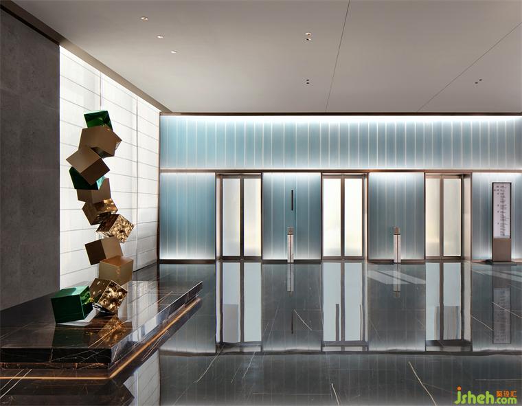 深圳國際會展中心希爾頓酒店到達(dá)門廳簡潔時(shí)尚的商務(wù)格調(diào),藝術(shù)品與電梯廳墻面融入不同程度的海洋藍(lán)輔色,既靈動空間,也呼應(yīng)國際會展中心「海浪」的設(shè)計(jì)理念。