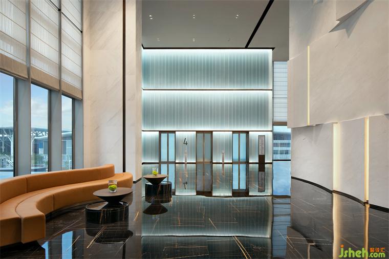 大堂與大堂吧更強(qiáng)調(diào)空間的功能性,為展會期間多人同時(shí)辦理入住提供條件。希爾頓酒店設(shè)計(jì)核心筒弧形墻面取意「船帆」,層疊的造型又似集裝箱堆砌,增添空間的趣味性與藝術(shù)感,也表達(dá)集聚的喜悅與對每一次揚(yáng)帆起航的期待。公區(qū)電梯廳延續(xù)「船帆」形態(tài),搭配金屬收邊,更具質(zhì)感。