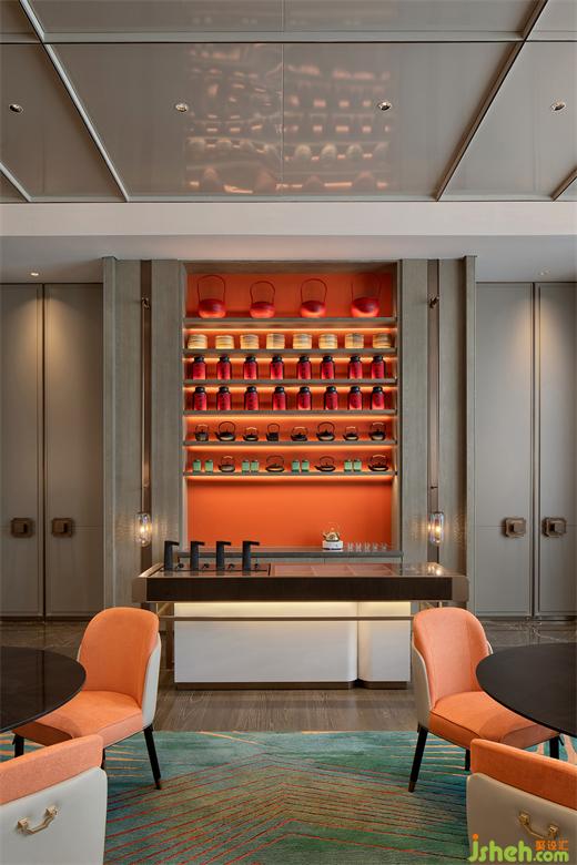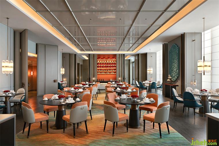 希爾頓酒店設(shè)計(jì)中餐廳入口接待出的背景墻一幅由嶺南鑊耳墻特色建筑抽象而成的藝術(shù)畫(huà)。取名「青雅」的中餐廳,意在營(yíng)造「琴棋書(shū)畫(huà),鳥(niǎo)語(yǔ)花香」中式優(yōu)雅用餐環(huán)境。廣府傳統(tǒng)建筑中的「青綠」與「橘紅」色調(diào),使中餐廳于古雅中包含熱情。