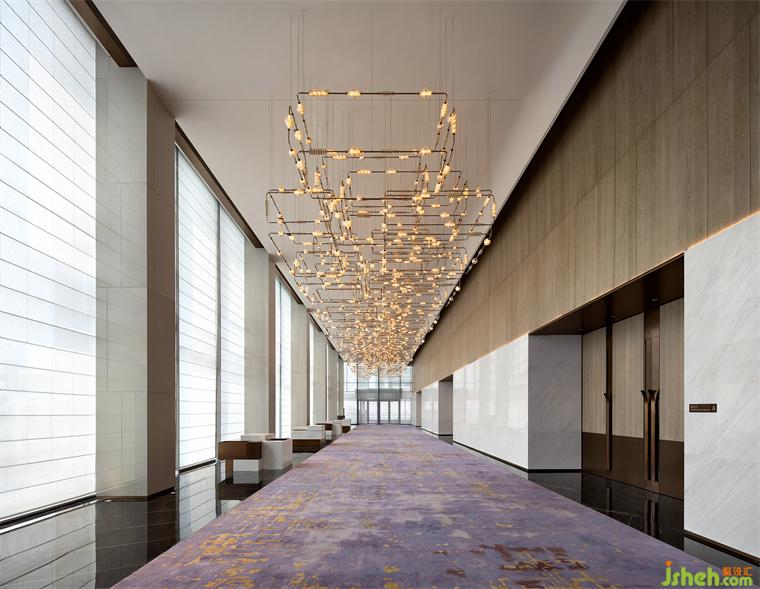 泳池的無邊際設(shè)計(jì)和藍(lán)色水面讓人仿若置身大海。端頭一座以水氣泡為設(shè)計(jì)原型的現(xiàn)代雕塑,金屬鏡面球體大小不一的疊加錯(cuò)落,希爾頓酒店設(shè)計(jì)映射出墻面深色大理石的「波浪紋」,同時(shí)與波光瀲滟的水面形成動(dòng)靜相宜,讓空間更顯活力。