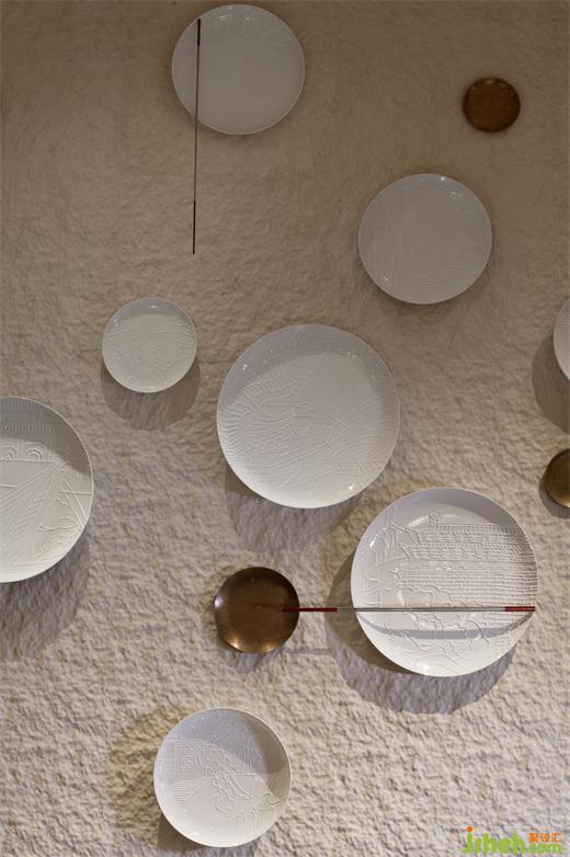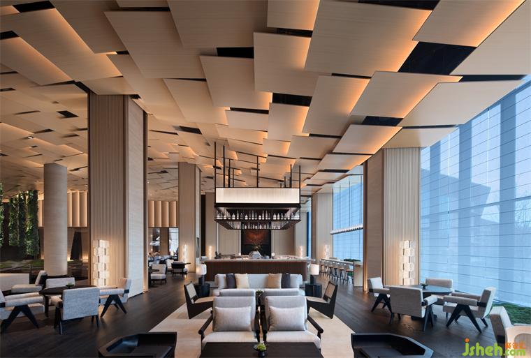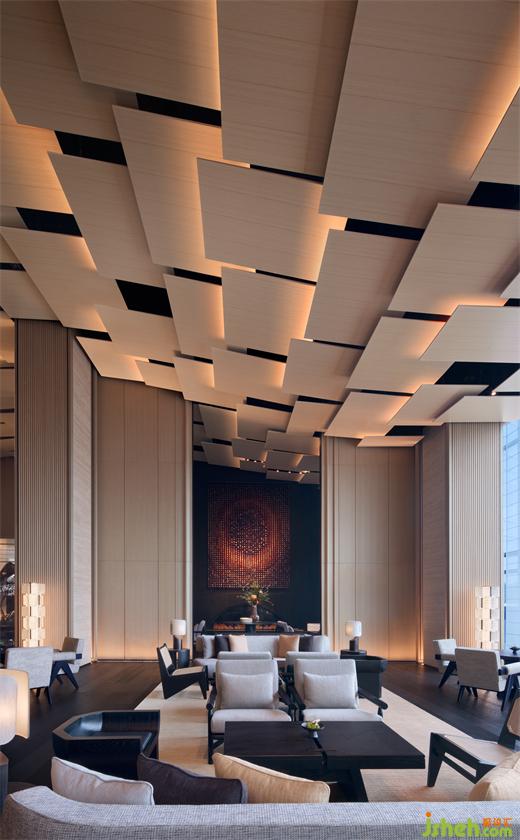 天花如袈裟懸浮,地面青苔隆起為山,數(shù)叢植物垂落成林。喧囂漸寂,建筑成了精神的容器,空與滿皆在光影中。將石材打磨出一圈圈漣漪,清波漫地,加強空間整體意韻時,并滿足荷載限制。大堂吧精心布局沙發(fā)、茶幾,打造自在休閑的社交區(qū)域,聚合人氣,形成功能上的“實”,與虛靜大堂互為映襯。