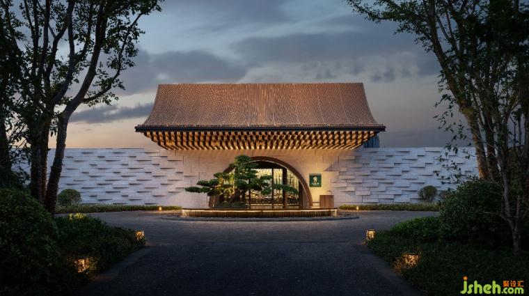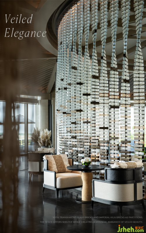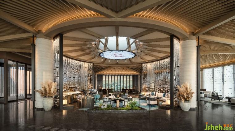 落客處水景與門洞互為映襯,寫意江南園林的經(jīng)典月亮門。大堂抬高使其懸浮湖面,邀人臨風(fēng)憑虛,攬湖天一色。中心下沉式大堂吧,創(chuàng)造視覺焦點并巧妙融合空間,層層遞進豐富感官。