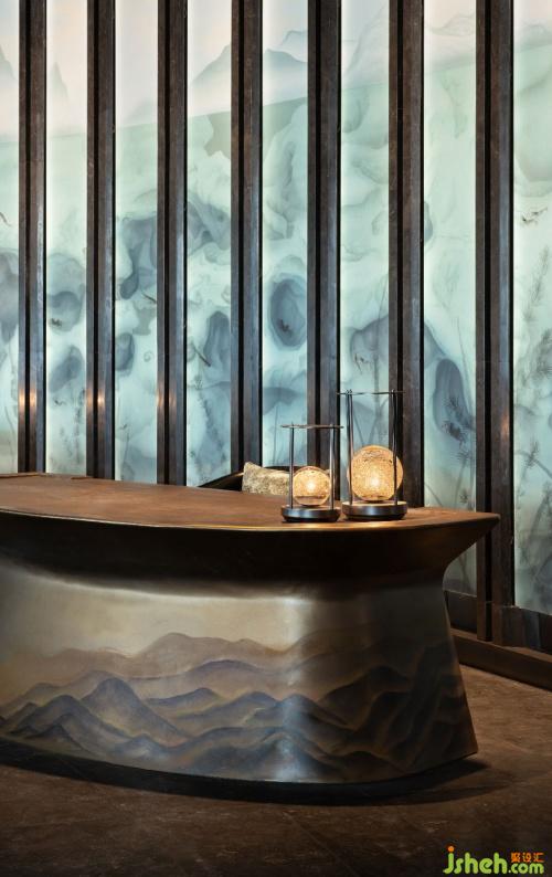 通透玻璃磚與相城十絕中的御窯金磚,似長詞短句,裁綴雅致簾幕,予人庇護并營造若隱若現(xiàn)的朦朧意韻。青綠水墨暈染總臺屏風(fēng)、天花上魚戲圖動態(tài)投影、湖藍家具與地毯,處處氤氳著江南詩意。