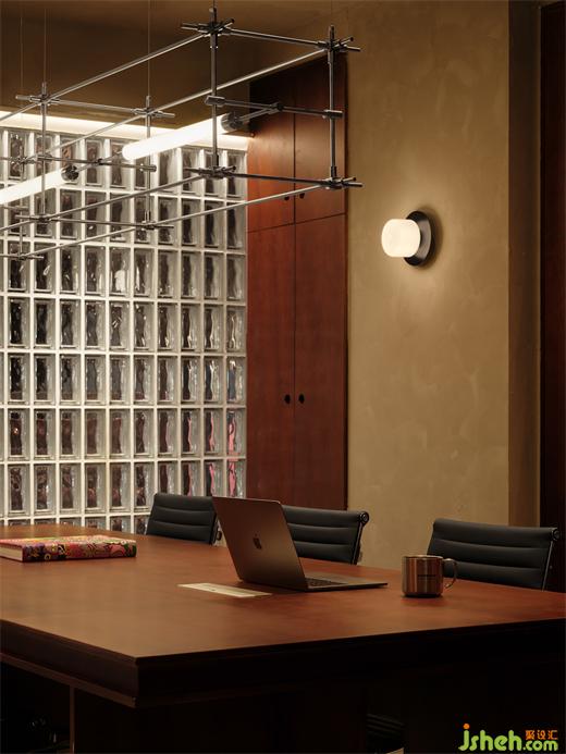 石質(zhì)臺(tái)階結(jié)合玻璃磚墻,劃分出較為私密的辦公空間。該空間也對到訪的客人開放。極簡一字型馬扎燈帶來均勻的光線,冷靜但又溫暖。橫平豎直的管線和書柜、玻璃磚形成了視覺上的呼應(yīng)。