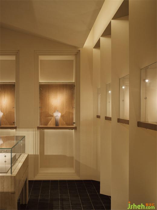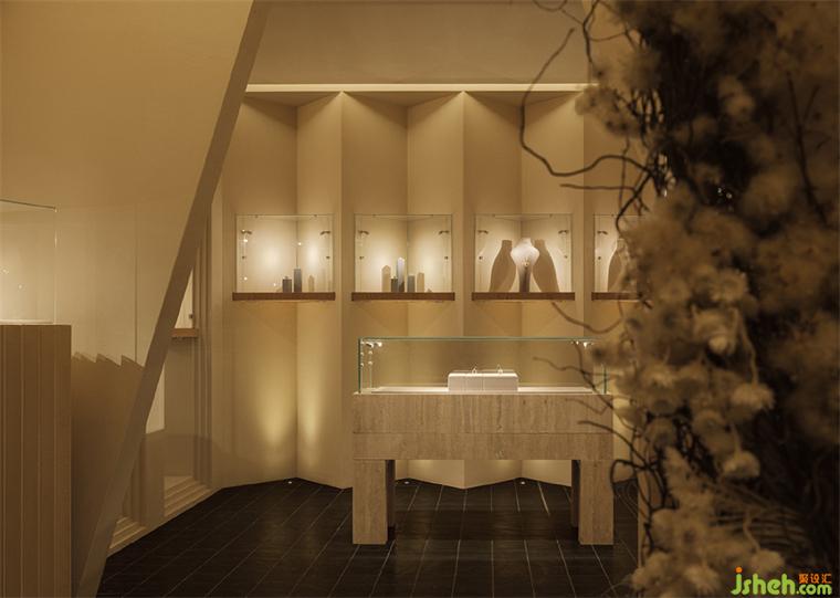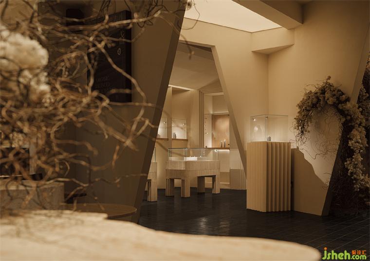 Flickering light dances across meticulously sculpted gems and jewels where the magic of the spring and infinite time was showed. The irregularly shaped ceiling and the restrained lighting create an atmosphere of tranquil. Time was settled. The wall with alternating curves and sharp edges generate a feeling of sculpture. The shape echoes the tools jeweler used to carve gems. The designers have employed the same technique to sculpt the spatial forms for guiding the visitors' sensory experience.