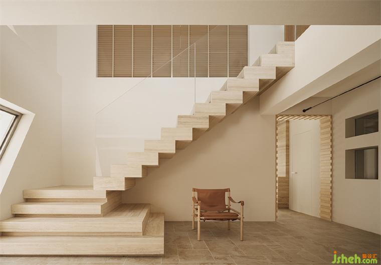 二樓與三樓連接處的樓梯,內(nèi)斂而安靜的色調(diào)搭配簡(jiǎn)約的幾何造型,將空間中平衡溫和的聲量放大,并延續(xù)至三層。三層主要作為主理人的辦公空間和開放的VIP空間使用。