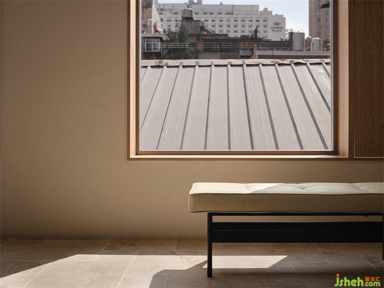 設(shè)計(jì)師在三層的設(shè)計(jì)中用了大量的矩形開窗,導(dǎo)入更多的自然光線,辦公室頂部的天窗,明亮但聚焦的光線滿足珠寶辨識(shí)的需求;飄窗里直白明麗的光線讓視覺與景觀連接;而南面大面積的玻璃磚,讓正午傾瀉而下的陽(yáng)光更和煦溫柔;西面的側(cè)窗,光線隱秘而溫和,將攝影室的私密性完整烘托。
