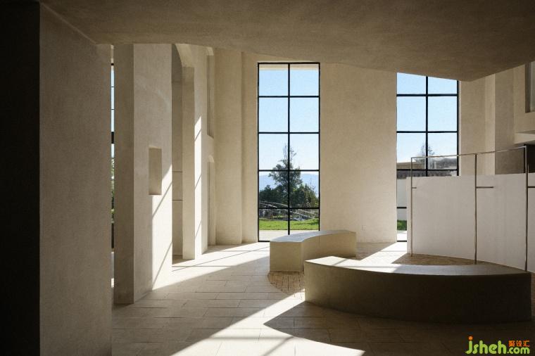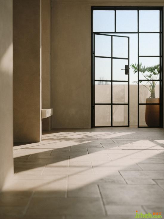 The minimalist lines add aesthetic charm to the space. The bare plaster walls are like a canvas, recording the shifting shadows and the passage of time from sunrise to sunset.