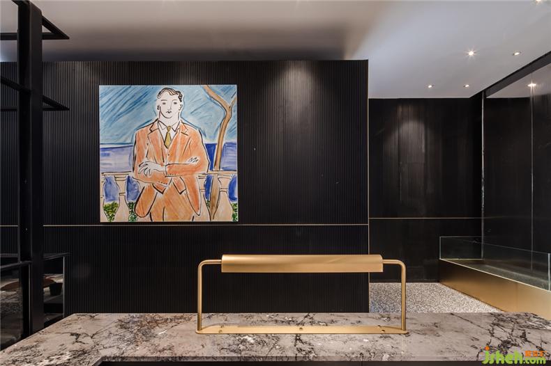 天花射燈與造型臺燈組合,墻面通過洗墻效果突出機理的同時提供了環(huán)境光,造型臺燈在工作維度上提供有效補充,為空間增加層次感。墻面與臺面的色彩對比同時形成強烈的視覺沖擊。餐廳設(shè)計