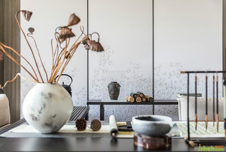 眼中看日升月落,筆下繪草木枯榮,書(shū)中品四季輪回。毛筆、筆架、花瓶、書(shū)畫(huà)、香爐,屬于中國(guó)傳統(tǒng)文化的元素一一鋪開(kāi),揚(yáng)起千年歷史塵埃。室內(nèi)設(shè)計(jì)師
