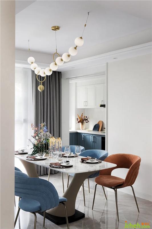 樣板房設(shè)計(jì)師并沒有用生硬的線條分割客餐廳區(qū)域,而是以一個(gè)矩形空間使人們的視覺自動(dòng)劃分開獨(dú)特的餐廳一角,既保持了客餐廳一體的寬闊感,又使餐廳具備一定的私密性,家具的圓潤(rùn)增添了空間的高級(jí)感與流暢性,營(yíng)造出靜謐舒緩的居住氛圍。