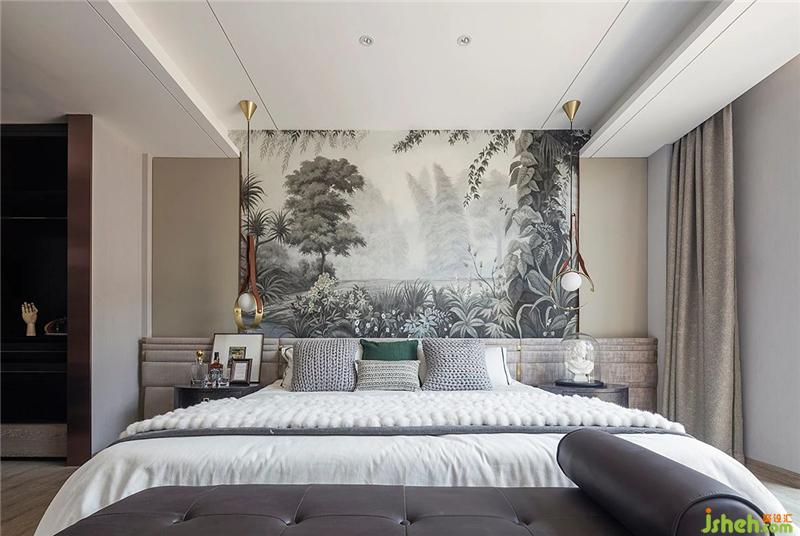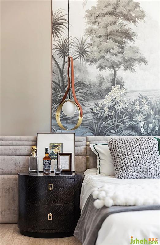 跟隨春意步入主臥,山林元素的床頭背景映入眼簾。簡約又不失品質(zhì)的家具與窗外床頭繁茂的山林相輔相成。滿足了現(xiàn)代人既追求都市時尚又渴望山間自然的矛盾心理。