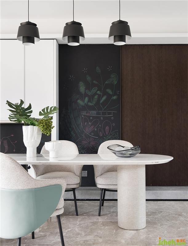在客廳打造一個趣味的互動空間,靈感來自于森林的綠意陽光以及小動物。讓藝術融入到生活的每個細節(jié),每個瞬間。生活的另一個重心當然就是孩子們,為了培養(yǎng)孩子的創(chuàng)造性,我們在這個家安排了秘密的小機關。比如餐廳墻壁上的“黑板”,鼓勵孩子們可以進行有趣的創(chuàng)作任由孩子在黑板上自由發(fā)揮自己想象的世界。