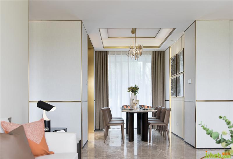 以“建筑”元素串聯(lián)出來的空間擁有一體化與完整性,設(shè)計(jì)師通過對(duì)空間的構(gòu)思與雕琢,用建筑的掛畫,橫平豎直的飾品擺放,再以圓形茶幾打破凌厲的線條感,把整個(gè)客廳與餐廳在三維上完全串聯(lián)到一起而不顯得突兀。