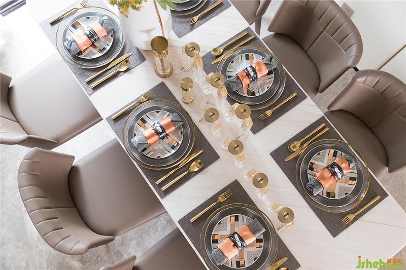 餐廳是彰顯空間細(xì)節(jié)和質(zhì)感的重要空間,酒具的質(zhì)感則體現(xiàn)在通透而帶著雕刻細(xì)節(jié)的紅酒杯與金屬醒酒器,這些飾品的色彩也與客廳的顏色相呼應(yīng)并與大理石桌面區(qū)分開成為整個(gè)空間的視覺中心。