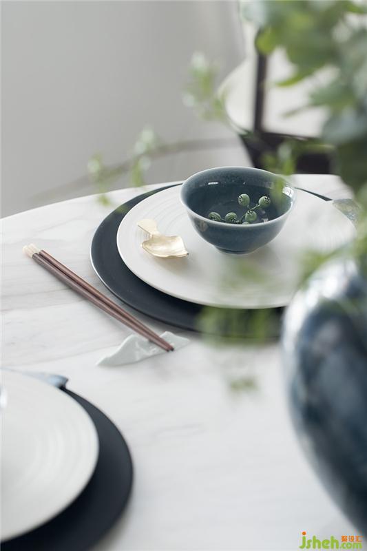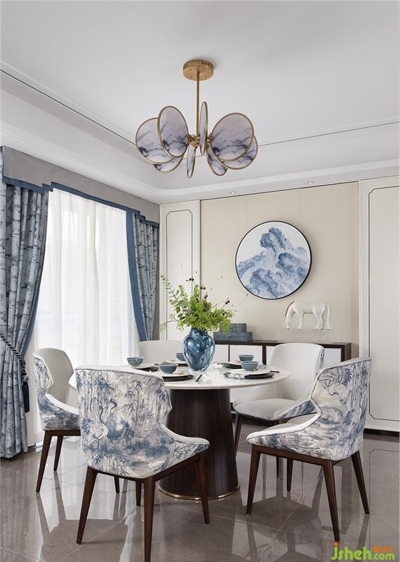 餐廳沿襲了客廳的特色,圓餐桌是中國家庭更青睞的形體,簡約的圓桌在青花椅的圍合間彰顯豪放的元青花特色,山巒掛畫下形態(tài)飽滿的蒙古馬閑適自得。