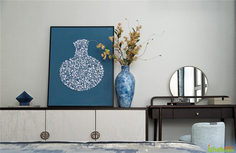 清代青花,歷經(jīng)元、明兩代后,洗盡鉛華,古樸精巧。長輩房的設(shè)計以樸實為主要基調(diào),家具陳設(shè)干凈簡練,裝飾品上體現(xiàn)清青花“青分五色“的多樣化細節(jié),豐富祥和。