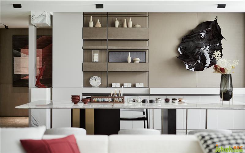 在工作區(qū)域我們提出“融居”的設計概念,讓漆藝的傳承、展示與生活為一體。大漆是有生命的,它在歲月與生活中不斷磨礪,當傳承傳統(tǒng)工藝的歷史使命混合當代人居氛圍,自然而融洽地演化出極具活力與藝術的現(xiàn)代精英氣息。