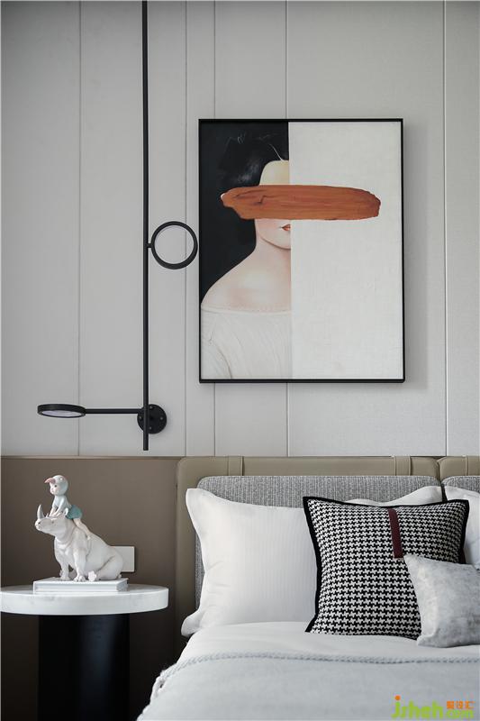 我們盡量在利用空間達(dá)到實用和美觀的統(tǒng)一。比如床與書桌組合的一體化設(shè)計,充滿線條感的油畫,潮玩始祖Be@rbrick單品的點綴,傳統(tǒng)與潮流以藝術(shù)手法新生共融,凸顯了當(dāng)代人對藝術(shù)的無限想象與個性的極致追求。
