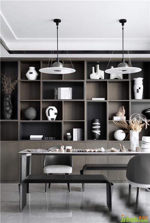 雙動(dòng)線的設(shè)計(jì)在這一隅開闊的空間中顯得游刃有余,品酒區(qū)與手工區(qū)空間既有界限又相互溝通,樣板房設(shè)計(jì)我們?cè)诙嘣木幼《x的思考下,將此打造為放飛想象制造泥塑的手工空間,在動(dòng)線的開合中更多了一些社交的空間表述,帶來宅居的全新體驗(yàn)。