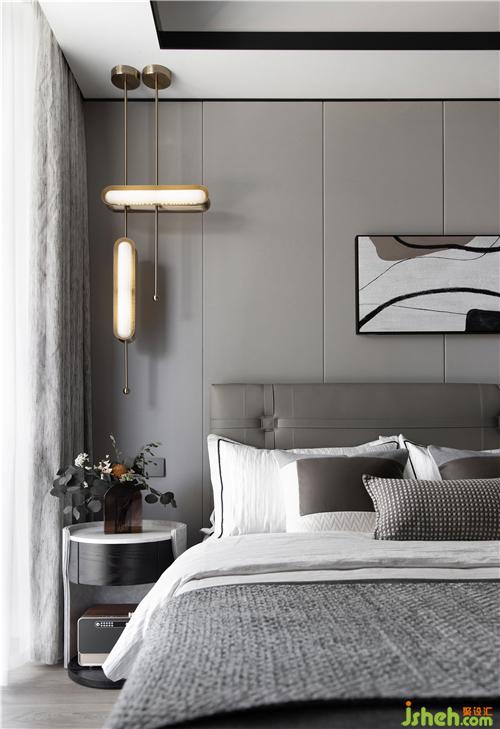 將高級灰與棕色完美配合打造尺度寬敞的主臥,樣板房設(shè)計(jì)呈現(xiàn)出簡潔又不落俗套的干練氣質(zhì)。