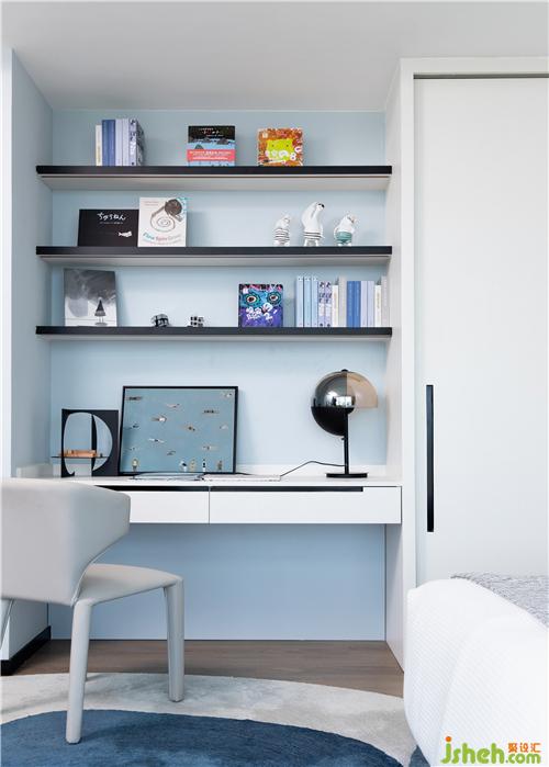 兒童房以感性的姿態(tài)將自然景觀引入,呼之欲出的海浪床背景呼應(yīng)窗外的海景,藍(lán)色調(diào)在兒童空間恰當(dāng)分布,如撲面而來的清爽海風(fēng),將童真趣味和溫情融合呈現(xiàn)。