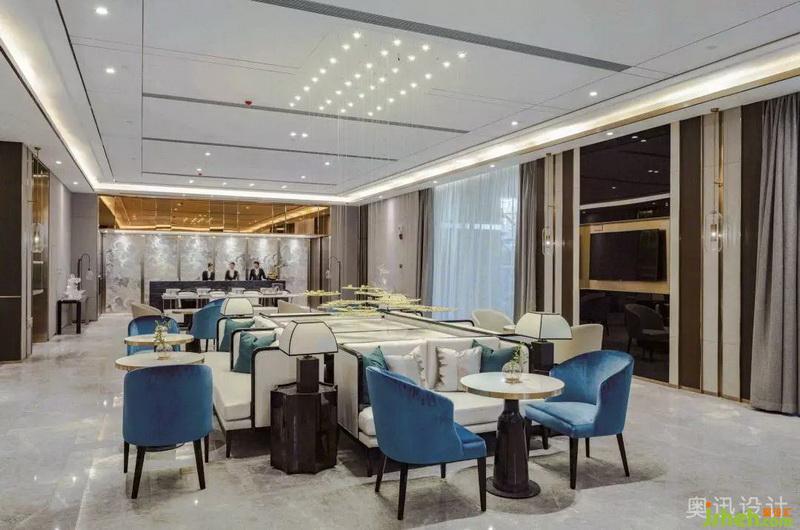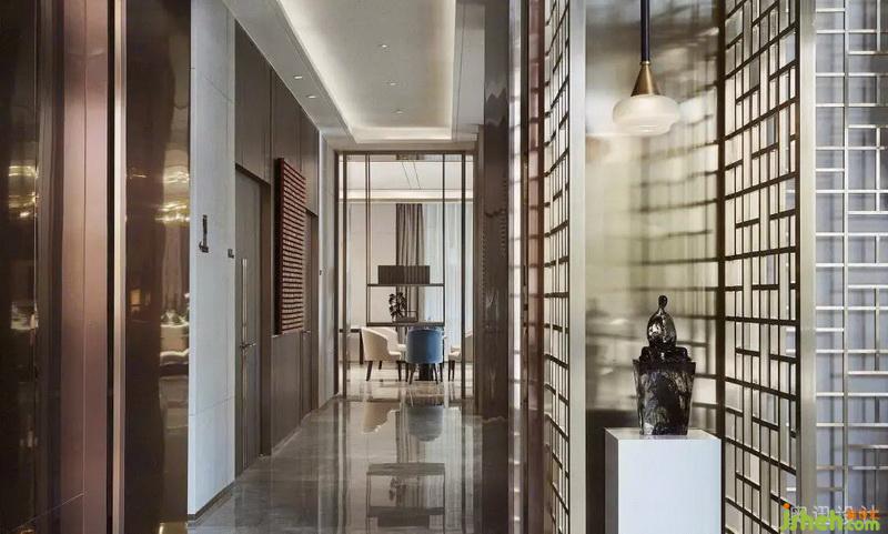 設計師在接待大廳上方以縱橫交錯的水晶吊燈,企圖烘托周邊環(huán)境的清雅。在光的作用下,似山的疊嶂,似水的柔美,與奈高斯白木紋石的背景墻、奧巴馬木紋石拼花的地面相互呼應,呈現(xiàn)出飄渺山水的靈動逸致。簡約的藝術擺件,淡化傳統(tǒng)文化符號的印象,獨具質(zhì)感的不銹鋼鏤空屏風和各空間以一種成熟而收斂的方式相互滲透,端莊豐華中透著柔情。