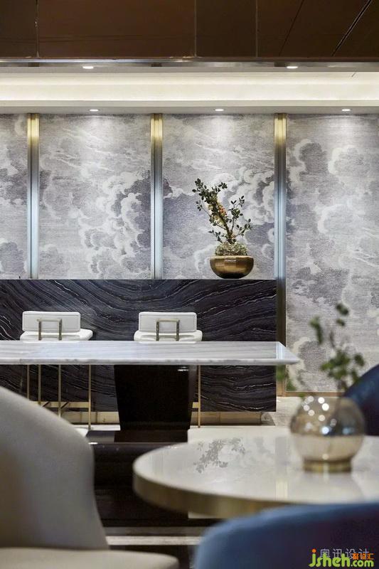 洽談區(qū)的空間布局延續(xù)了建筑的軸線關(guān)系,通過淡雅的藍、柔暖的白、知性的靛青等色彩的碰撞,增添了空間明亮的通透感。大篇幅的藝術(shù)背景畫伴隨著金屬的分割和暈染效果,融合山水意象的擺件,通過光影的視覺沖擊給空間注入力量,營造出靜謐的禪意?;氐娇臻g的本質(zhì),營造內(nèi)斂平和的洽談氛圍,閑看花開花落,靜品茶甘茶香。
