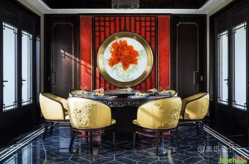 現(xiàn)代設(shè)計(jì)的牡丹花吊燈與背景的牡丹夾絹交相輝映,色彩與廚房的隔斷木格屏風(fēng)形成巧妙聯(lián)結(jié)。紅色的樹(shù)脂墻身傳遞著中國(guó)紅的視覺(jué)能量,形成獨(dú)具一格的空間感。與之對(duì)應(yīng)的青花瓷擺件亦增加了空間的收藏歷史意味。