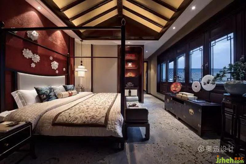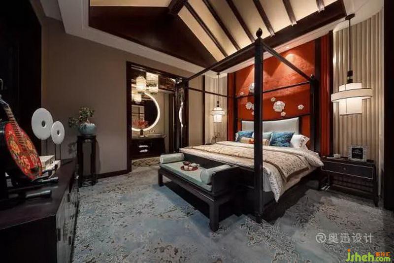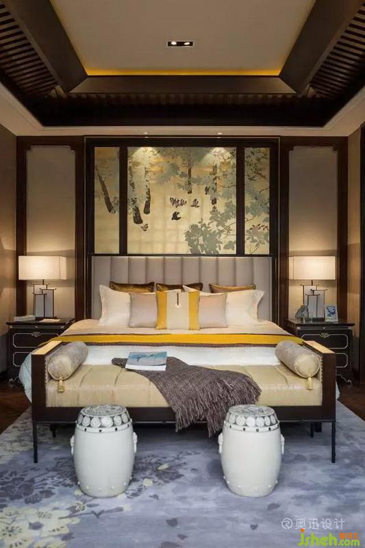 以不同灰度相融調(diào)節(jié)視覺(jué)調(diào)性,強(qiáng)調(diào)舒適感,床頭的手繪墻紙?jiān)俅纬憽澳档ぁ敝黝},在中式吊燈的映襯下,盛開(kāi)得格外艷麗;私密的臥室沿襲了整體空間的清雅與平和,空間色彩、形式,無(wú)一不在提示著過(guò)去、現(xiàn)在,東方人文的演變與糅合。