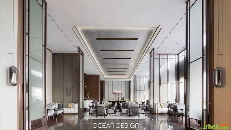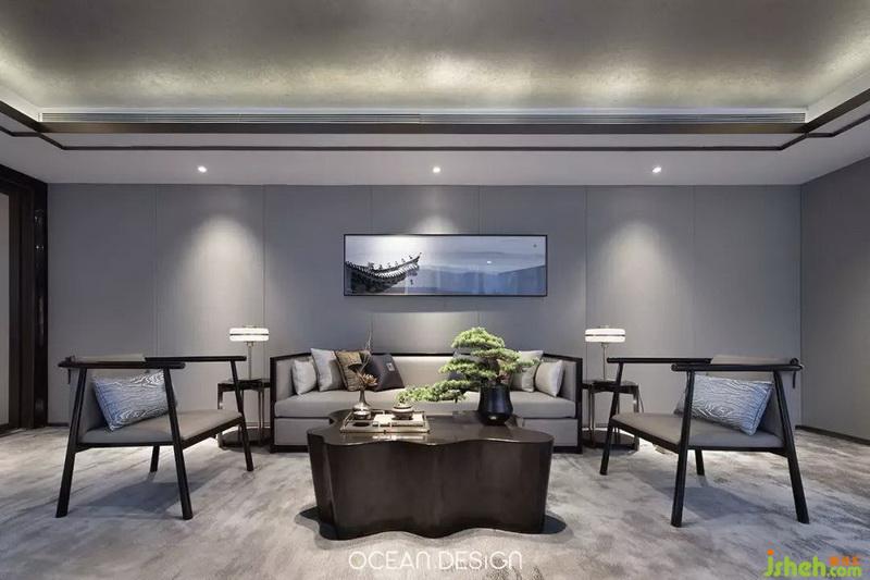 移步洽談區(qū),保留著中軸對(duì)稱的開放式布局,融入飄逸靈動(dòng)的中式傳統(tǒng)風(fēng)格,結(jié)合現(xiàn)代審美藝術(shù),形意兩全。這里沒有濃郁的商業(yè)氛圍,設(shè)計(jì)師將清新卻不失典雅的高級(jí)灰與現(xiàn)代元素結(jié)合在一起,讓人仿佛置身于現(xiàn)代都市的山水景色之中。