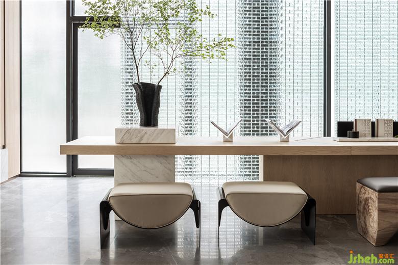 基于“人景交互”的理念,設(shè)計師在開放式的空間布局納入更多自然清氣,以現(xiàn)代形制的家具陳設(shè)糅合山湖元素,將洽談區(qū)打造成像咖啡廳般的休閑空間,伴隨“隔簾花葉有輝光”這樣的景致,營造輕松舒適的洽談交流氛圍。