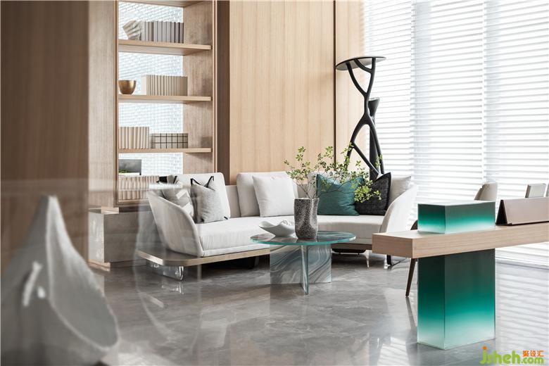 在設(shè)計師看來,如果說洽談區(qū)是交際暢談的空間,那么休閑區(qū)則更像是悠然自在的角落。素白的流線型沙發(fā)和似水、如石的材質(zhì)碰撞,打破空間的一致性,并借由書籍烘托的自然之氣,渲染著一種自然棲居精神驛站的文化體系,為來訪者的生活接觸與感情交流實現(xiàn)串聯(lián)。
