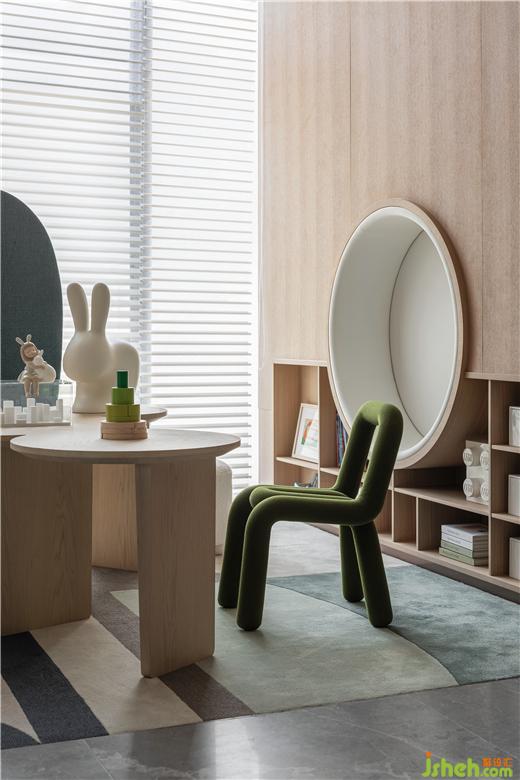 自然材料與鮮艷色彩結(jié)合,賦予了兒童空間舒適自由、靈動現(xiàn)代的格調(diào)。設計師意構溫暖的空間意趣,一如為孩童搭建愛麗絲夢游仙境,這里有奔跑的小兔子,鮮艷的花兒,上演著一個個生動有趣的綠色故事。